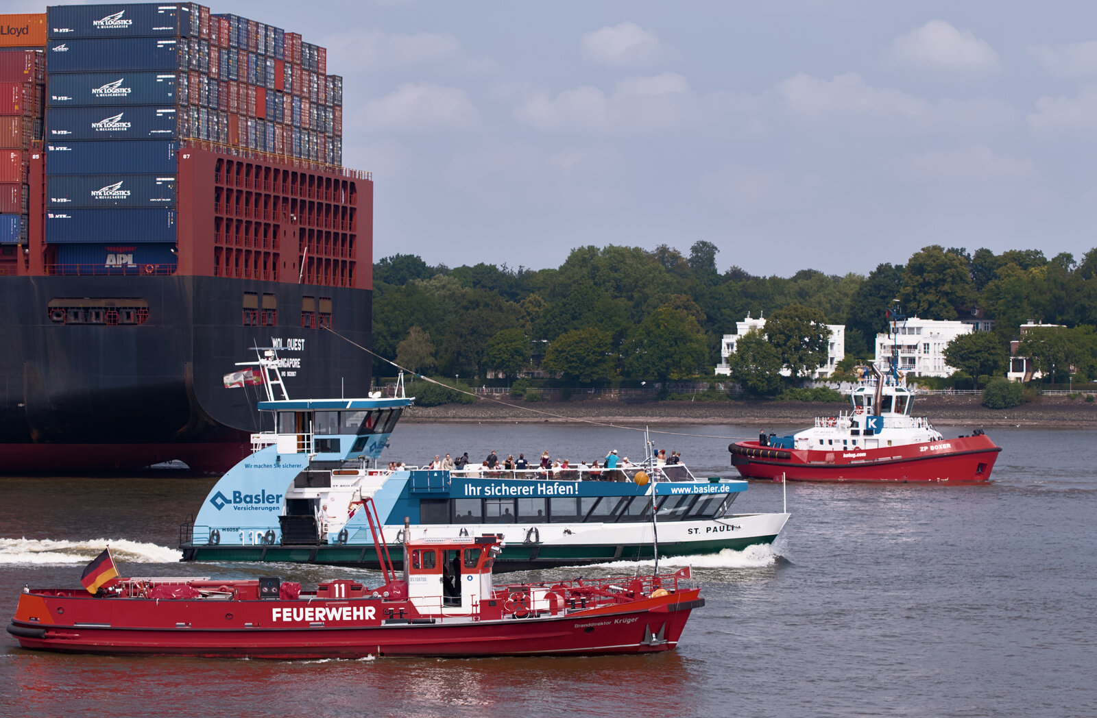 Warum ist das eines meiner Lieblingsfotos? Bei meinem Spaziergang durch den „Gorch-Fock-Park“ bleibe ich gerne kurz an der Stelle des kleinen Denkmals für den Schriftsteller aus Finkenwerder stehen, wo man die beste Aussicht auf die Elbe hat und schaue mich um. Als ich Richtung Wedel blickte, sah ich zuerst den Schlepper und das Containerschiff am Haken. Außerdem sah ich, dass das Feuerwehrboot „Branddirektor Krüger“ zu einem Überholmanöver ansetzte. Keiner hat Lust, zu lange hinter einem behäbigen Containerschiff zu verweilen. Vermutlich fühlte sich die Hafenfähre dadurch angestachelt, sich ebenfalls dazwischen zu setzen, um pünktlich in Finkenwerder anzukommen. Mein Gedanke in dem Moment war dann: „Wenn ich genau zum richtigen Zeitpunkt knipse …“. Ich bekam ein Foto so Hamburgisch, wie Michel, Franzbrötchen und Stau auf der A7. Ein Containerschiff mit Schlepper, eine Hafenfähre und ein Feuerlöschboot veranstalten ein Rennen um den Einlauf. Diese Szene, auf der sich alle auf derselben Höhe befanden, habe ich nie vergessen.