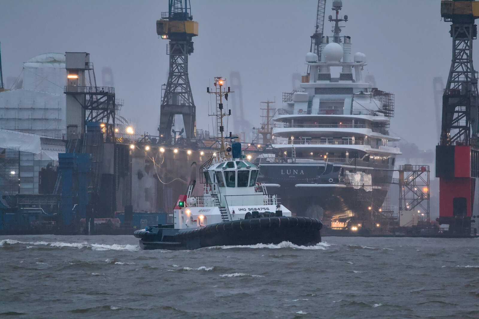 Man, lag ich falsch. Als ich auf den Landungsbrücken die Brücke 10 erreicht hatte, schüttete es so sehr, dass ich nicht mehr wusste, ob die Elbe nun unten oder oben war. Dazu peitschte ein demotivierend kalter Wind, der das Wolkenwasser unter jeden noch so gut überdachten Fluchtwinkel trieb. Ich war nicht mehr nur nass, ich war supernass. So kauerte ich mich in die hinterste Ecke der Buden auf dem Schwimmponton der Landungsbrücken und versuchte mir die Zeit zu vertreiben. Ich holte meine Kamera raus, begann zu knipsen, in der Hoffnung, dass die Gerätschaft meine falsche Prophezeiung überleben würde. Als Dank für meinen „Mut“ bekam ich als Motiv einen tapferen Schlepper, auf stürmischer Elbe, vor einer Superjacht im Dock Elbe 17.