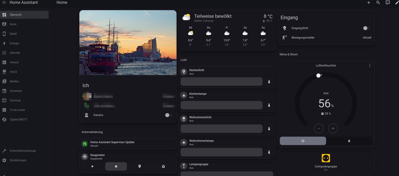 Der Home Assistant ist eine open source Lösung für die Hausautomation. Ich kann also nicht nur meine Lampen steuern, ich kann auch meinen Staubsauger herumkommandieren, Events mit dem Bewegungsmelder abfangen und eigentlich alles steuern, was auch nur einen Hauch smart ist. Eine große und aktive Community kümmert sich nicht nur um die Weiterentwicklung, sondern auch um viel, sehr viele Erweiterungen. Home Assistant kann mir inzwischen sogar sagen, wann der Bus bei mir fährt und spielt nebenher noch meine Musik ab. Zudem ist alles sehr frei anpassbar. Wer genügend Zeit und Muße mitbringt, kann Dashboards bauen, die irgendwann vielleicht als Kunstwerk gelten, wer weiß.