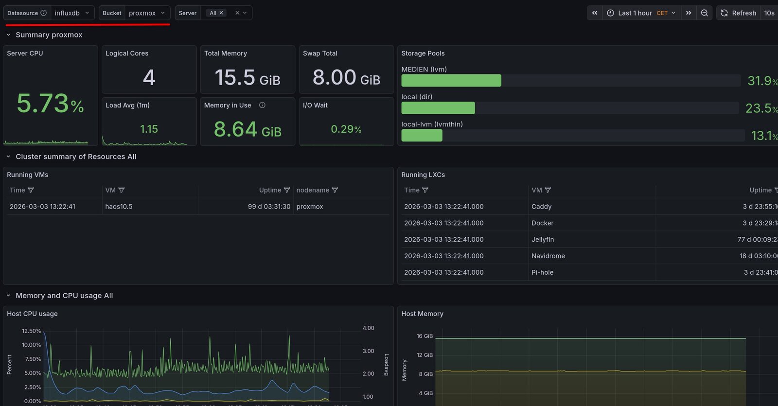 Ist alles konfiguriert, erwacht das Dashboard zum Leben. Es kann etwas dauern, bis genügend aussagekräftige Daten aufgelaufen sind. Zu sehen sind dann allgemeine Informationen zum Proxmox Note und Metriken zur CPU-Last, RAM-Verbrauch, Netzwerkverkehr und I/O Operationen der einzelnen LXC und VM. Ganz genau so, wie ich es gerne hätte.