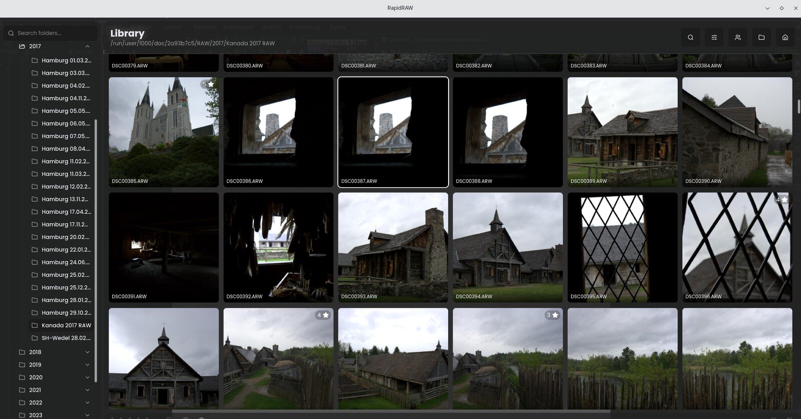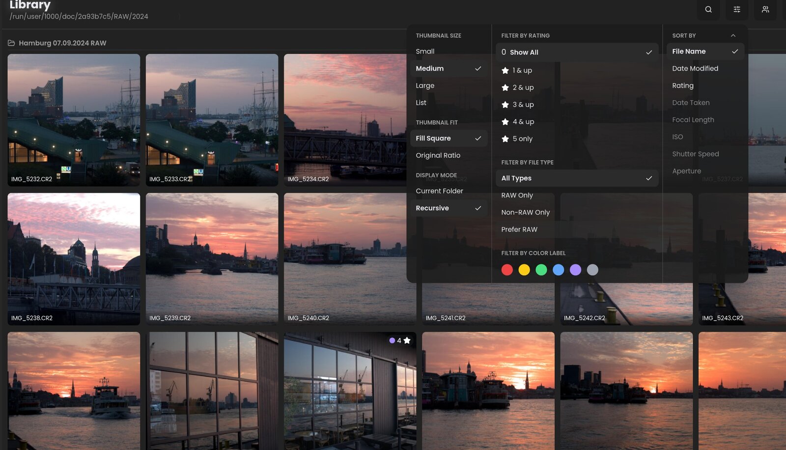 Hat man den Order ausgewählt, wechselt man in die Bibliotheksansicht. So, oder so ähnlich, kennt man es auch von anderen Tool, wie Lightroom und Darktable. Die Thumbnails werden sehr zügig erstellt. Einmal erstellt, laden die Thumbnails deutlich schneller. So kennt man es, so liebt man es.